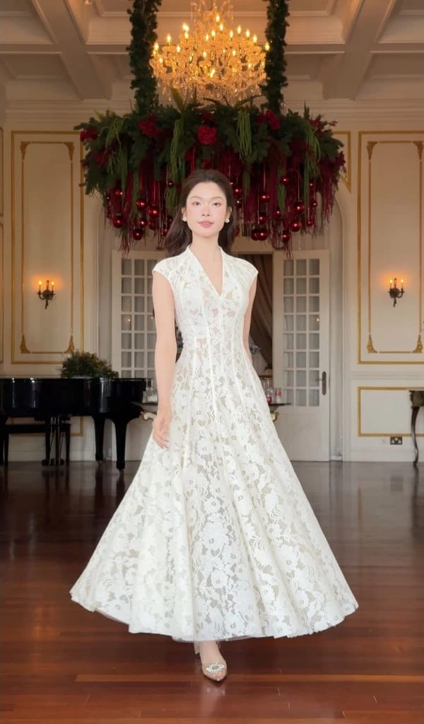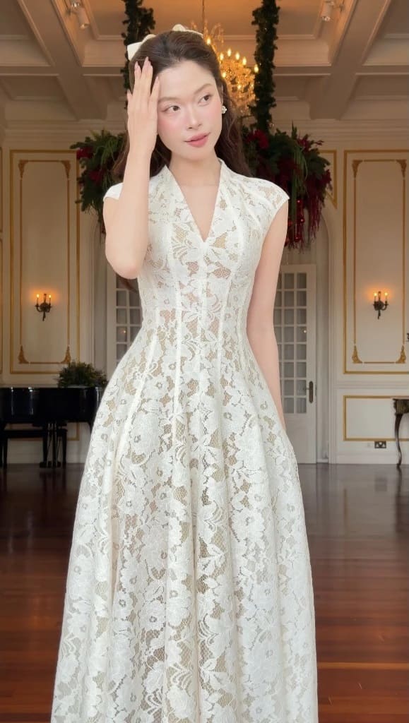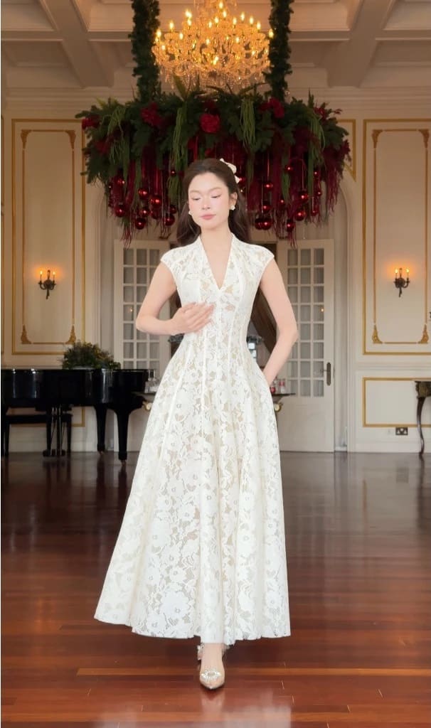 Thiết kế đầm ren cổ V cao dáng xòe.